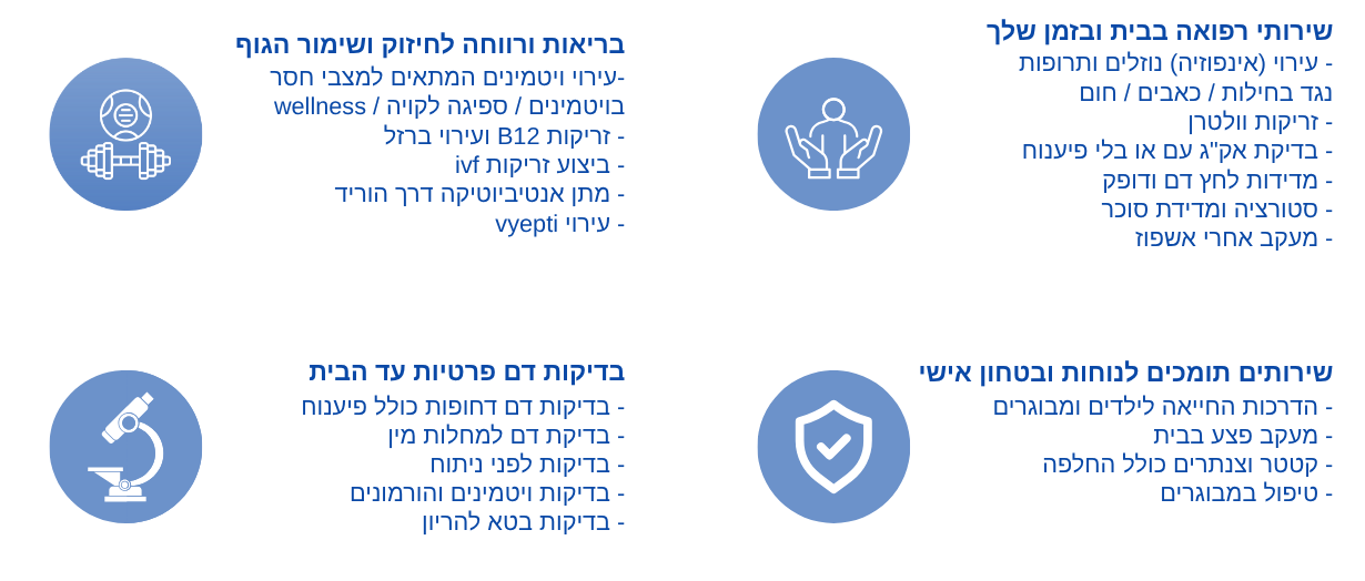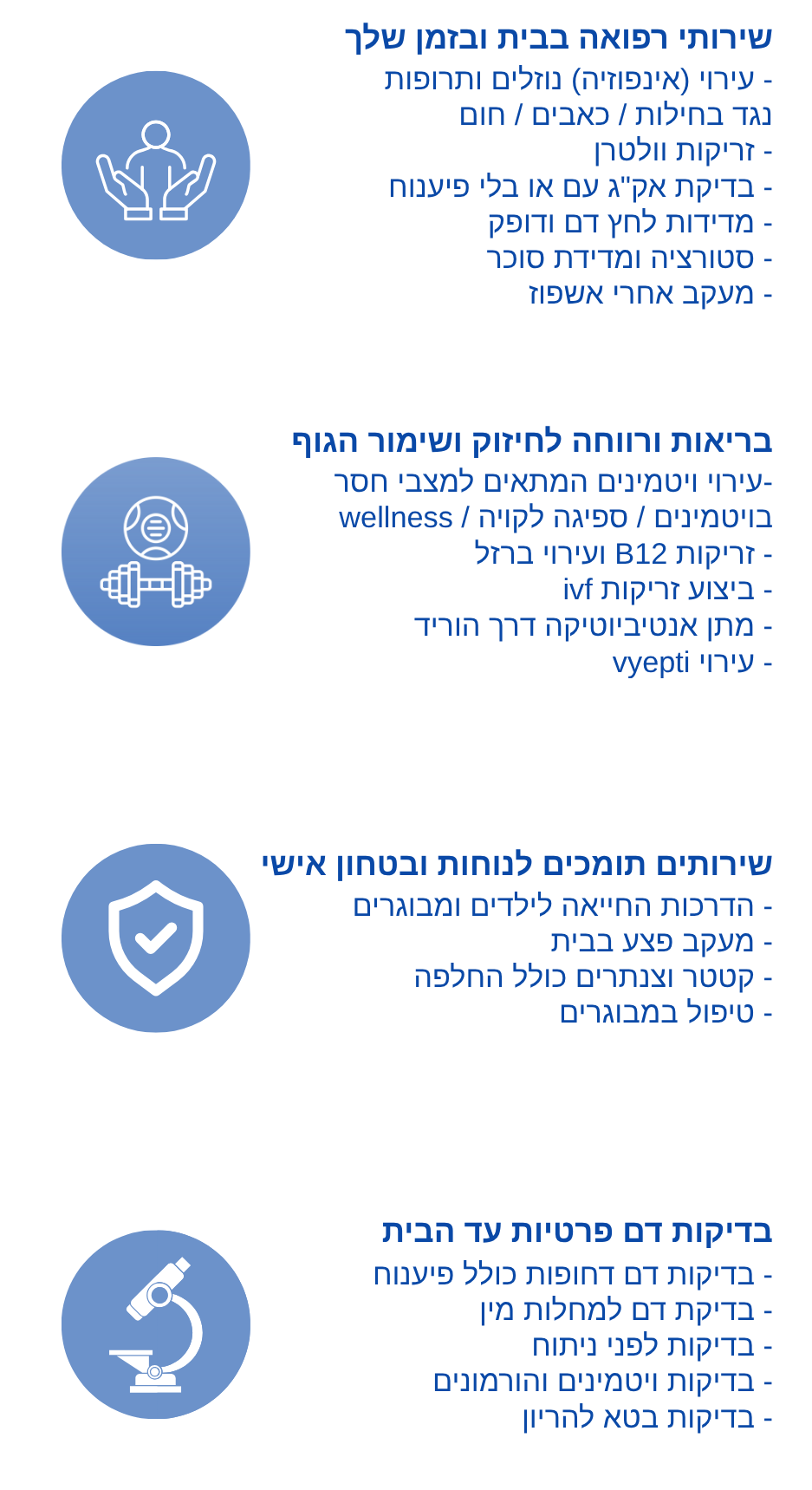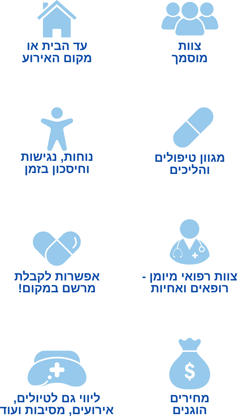 צוות הרופאים והמטפלים שלנו מספק שירותי רפואה מקצועיים 24 שעות ביממה, 7 ימים בשבוע, היישר עד לביתך או למקום שהכי נוח לך.