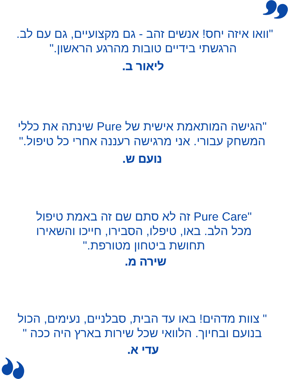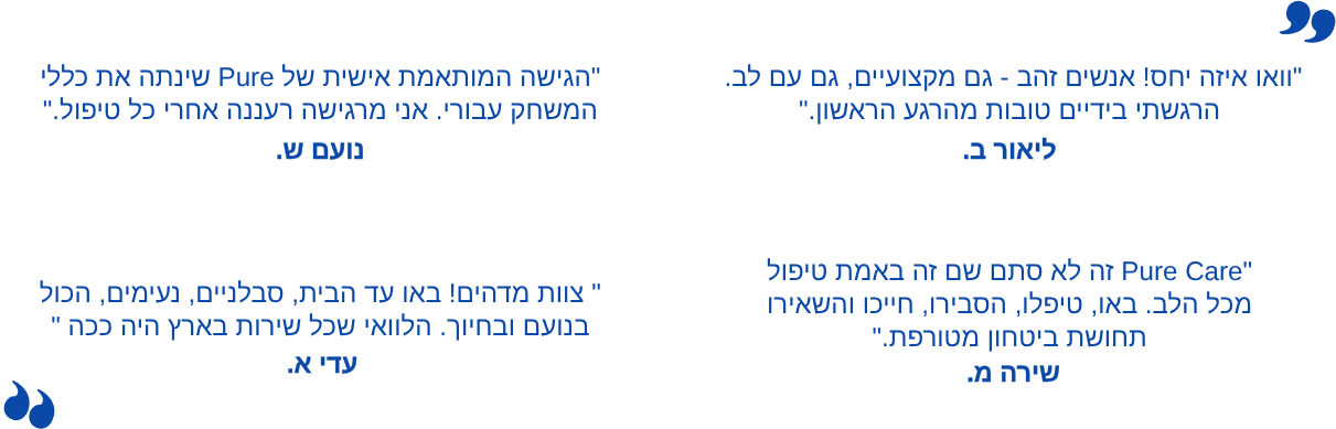ב־Pure Care אנחנו מאמינים שטיפול רפואי איכותי צריך להיות זמין, אישי ונוח — בכל שעה ובכל מקום.